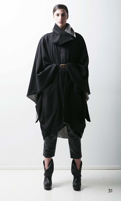 The shapes are strong and geometric. Soft, oversized shoulders are emphasized by a clearly defined waist courtesy of big asymmetrical belts. Large kimono and raglan sleeves add drama to the outerwear. Coats are deceptively layered in Cubist inspired patchwork. Wide or 'A' line skirts make use of big pleats and folds for extra movement and often stop at or below the knee. Soft, draped shawl and big stand up collars envelope the face. Trousers, narrow or wide with a nod to menswear, are kept short.