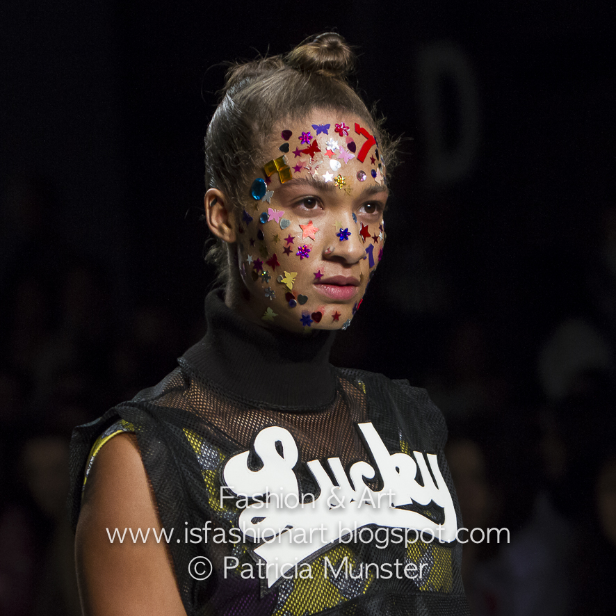 Esther Haamke's collection was all about glamorous street wear. It is a humorous take on the materialistic society, playfully using casino signs, lucky charms, bright colours, glitter and full of prints, Esther's speciality is illustration and I loved the maneki-neko, the lucky cat.